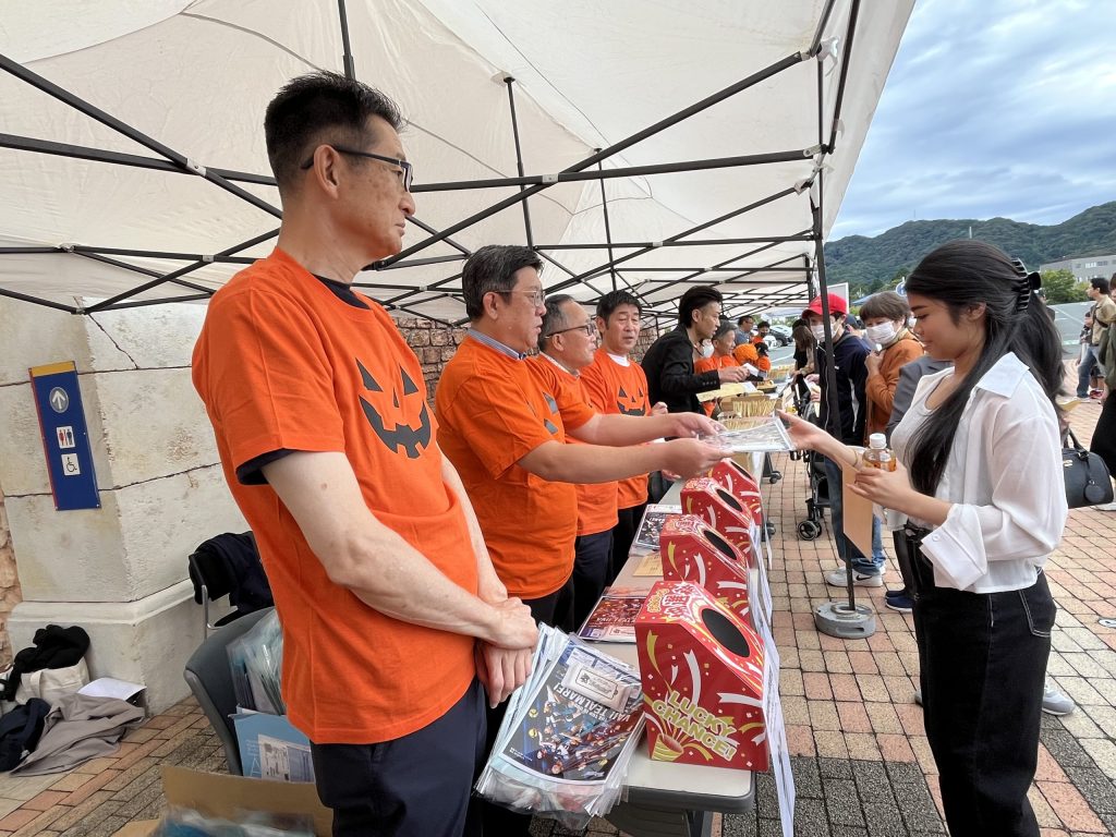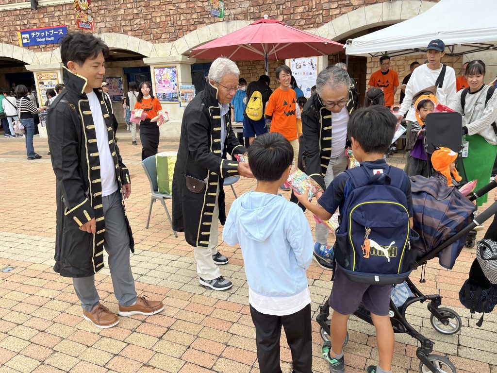 受付では工場長、部門長がお出迎えを行い、仮装をした当社役員、労働組合委員長から、お子様へお菓子のプレゼントがありました。